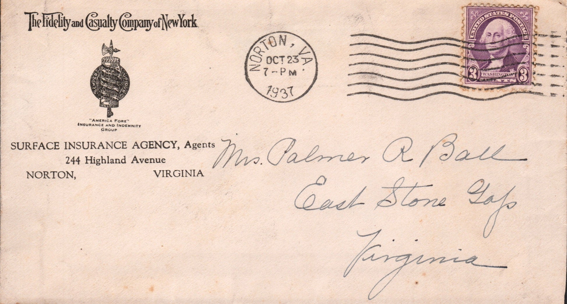 Norton 1937 machine cancel on cover, “Surface Insurance Agency” corner