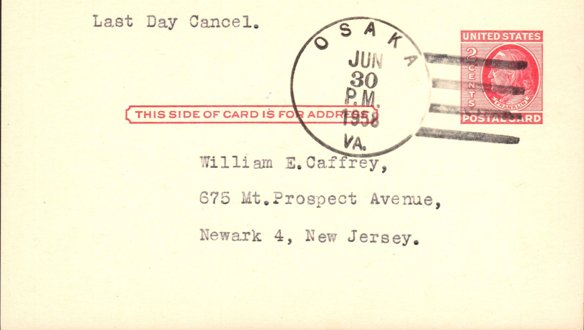 Osaka (1902-1958) 1958 4-bar on LD Postal Card, round dater on back