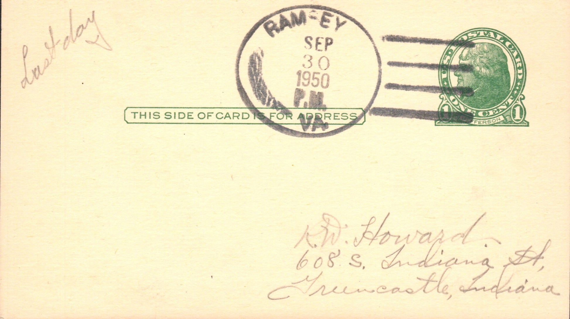 Ramsey (1949-1950) 1950 4-bar on Postal Card, PM autograph