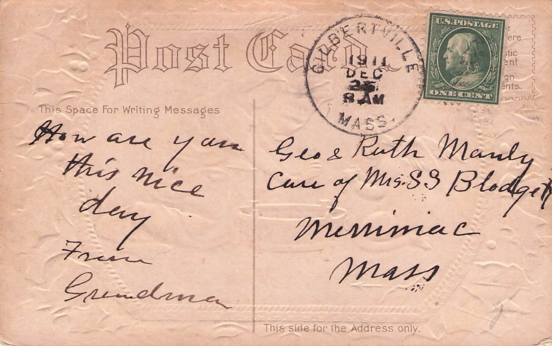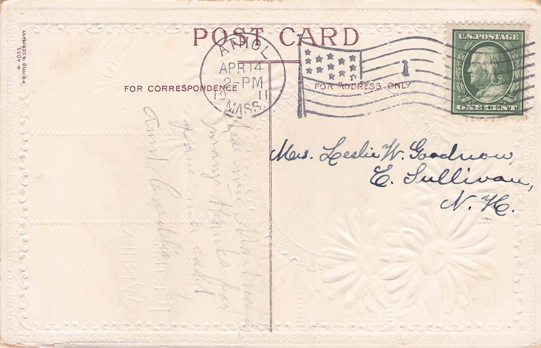 Gilbertville 1911 duplex on post card; 1976 4-bar on cover