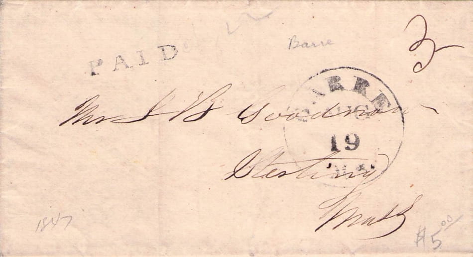 Barre 1847 stampless cover, 3¢ rate and stamped “PAID”