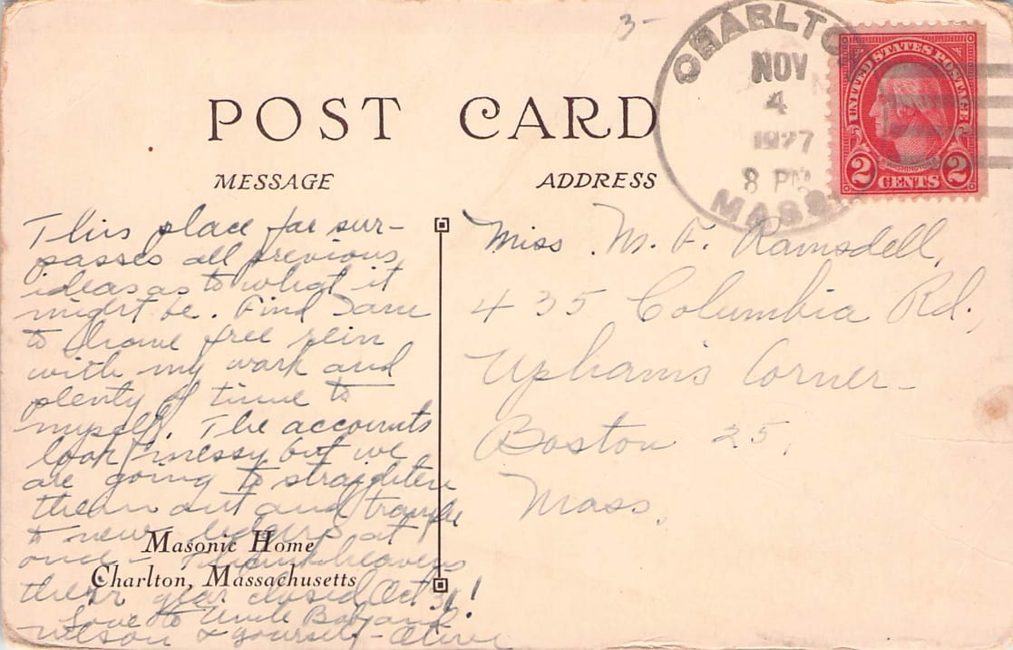 Carlton 1927 4-bar on post card, view of Charlton Masonic Home