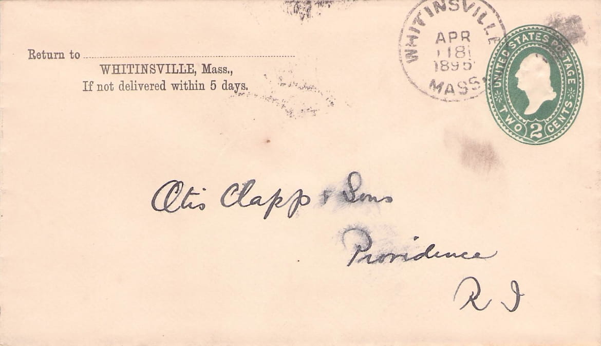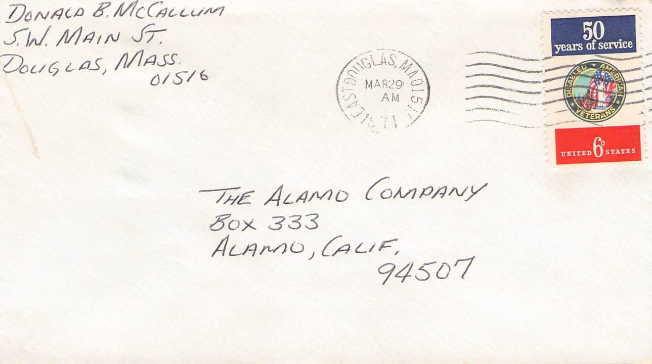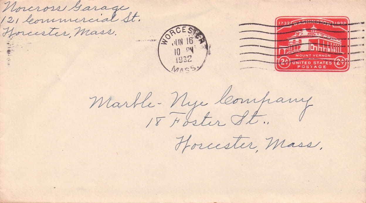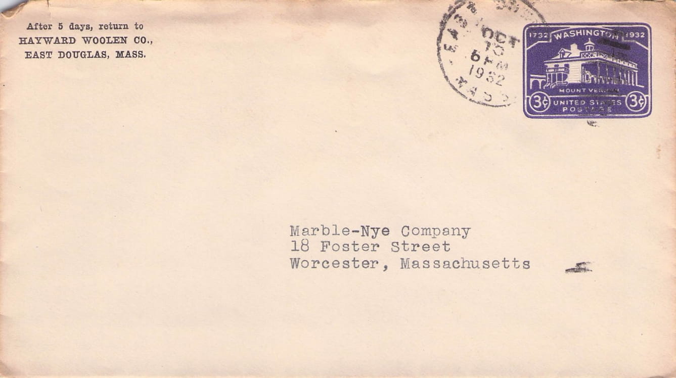 East Douglas Indistinct 1932 duplex on cover, “Hayward Woolen Co.” corner; 1971 machine cancel on cover