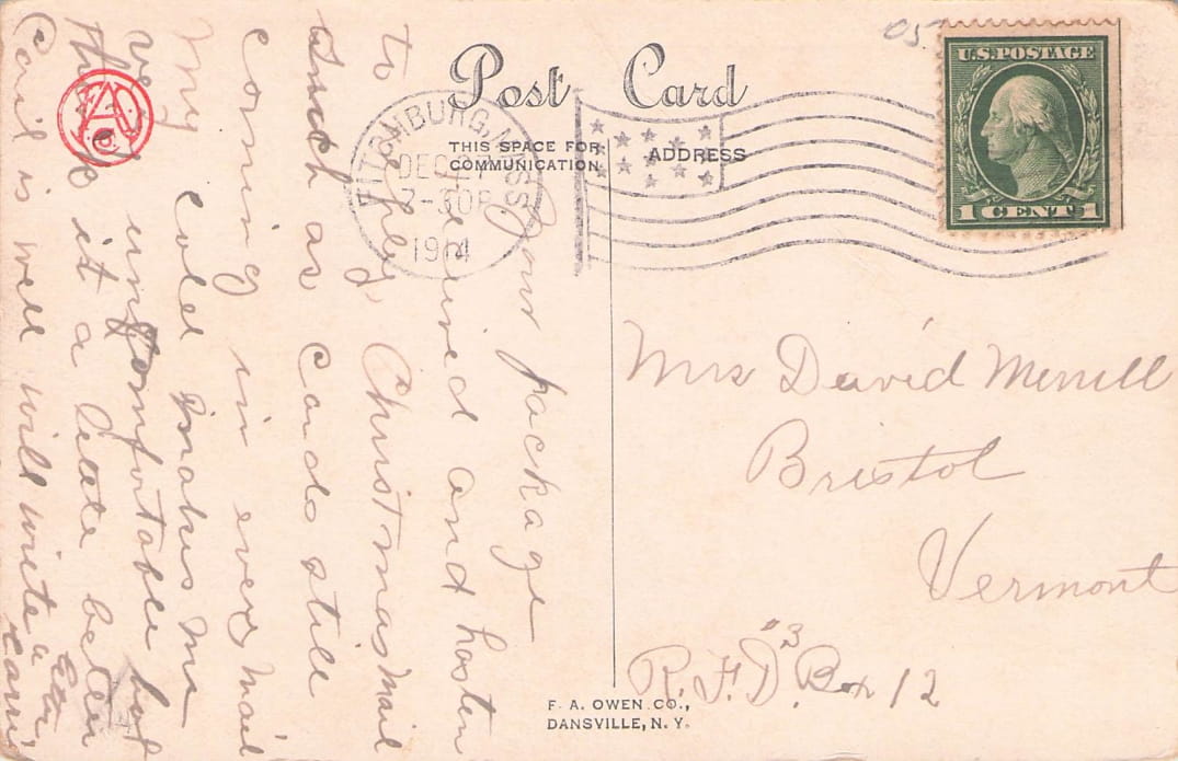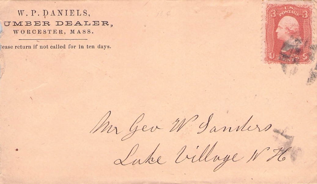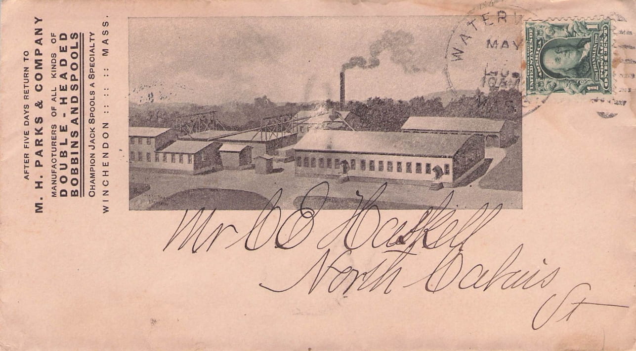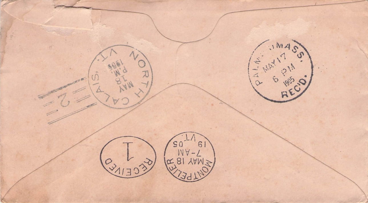 Waterville 1905 duplex on illustrated cover “M.H. Parks & Company” corner and picture of factory. Reverse has Palmer, Mass, Rec’s, Montpelier Vt. Rec’s and North Calais, Me. Doane as Rec’d at destination.