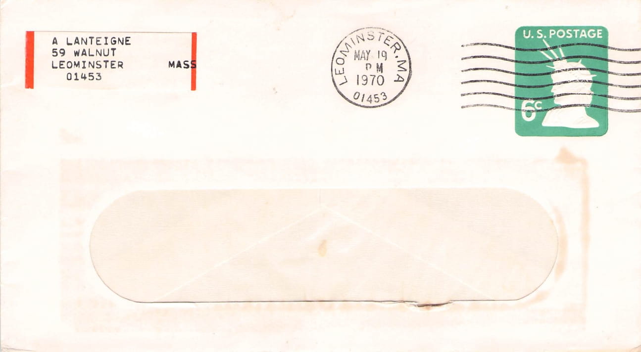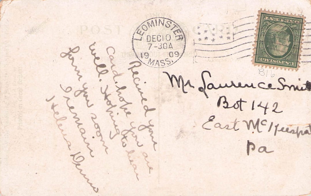 Leominster 1909 Flag cancel on post card, “The Old Abbey”; 1966 FD of issue of 5¢ Johnny Appleseed sramp on cover 1970 machine cancel on cover