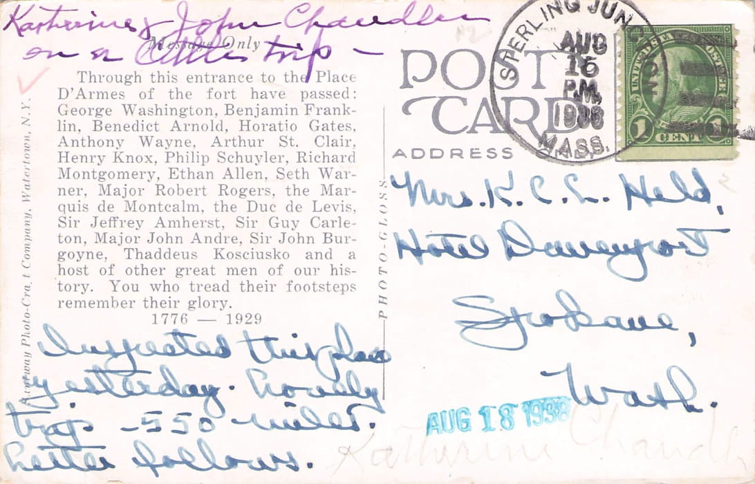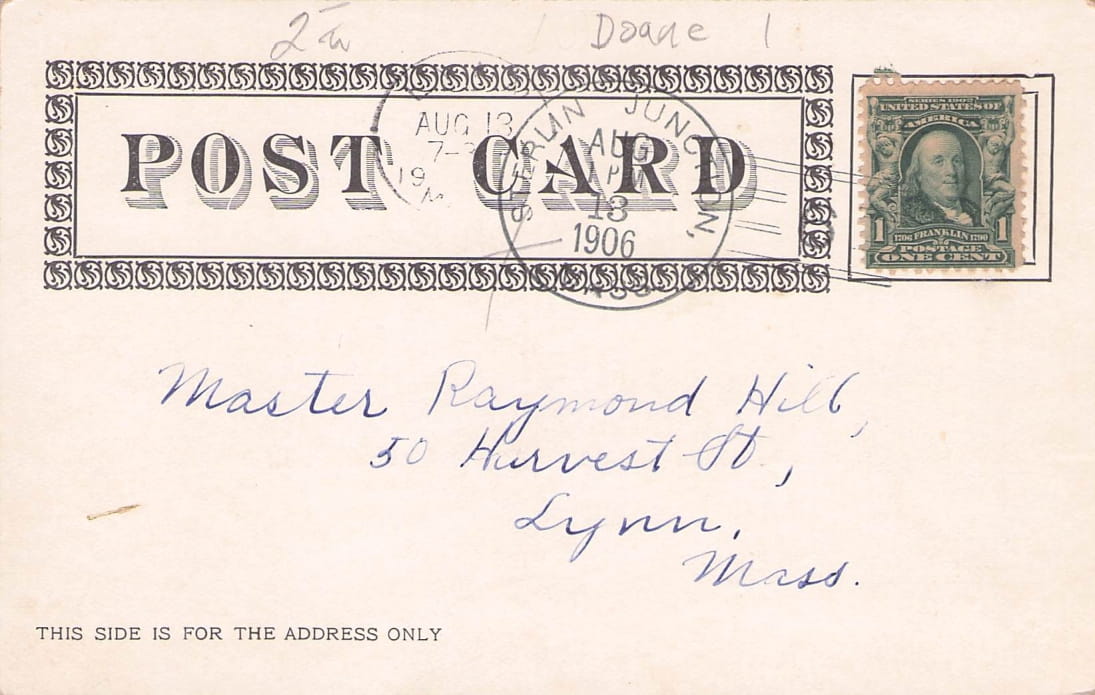 Sterling Junction 1906 Doane on post card - all letters are nicely struck, except there is no “G” - an error?; 1938 4-bar on post card