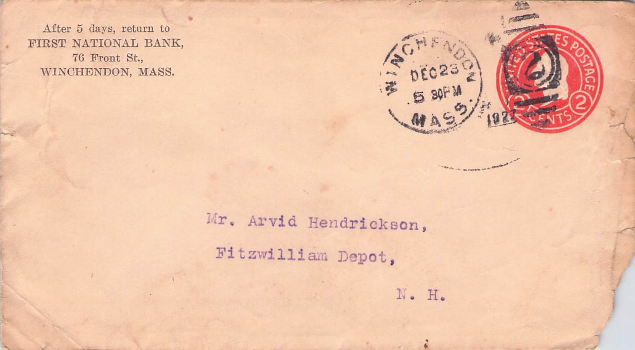 Winchendon 1870s cds & cork killer on small cover; 1922 date-out duplex on cover, “First National Bank” corner.