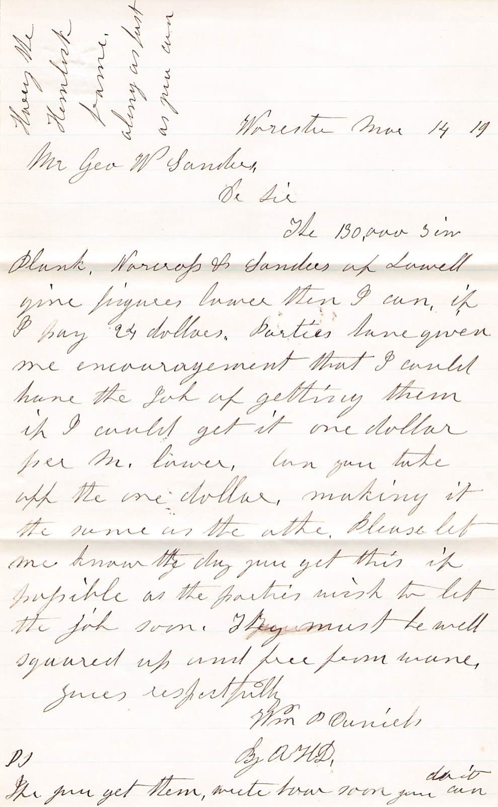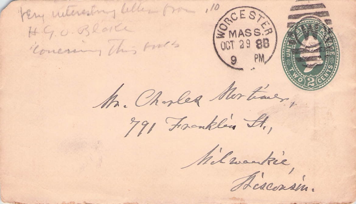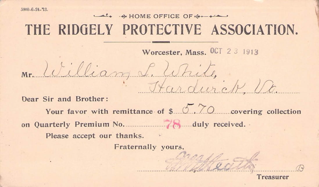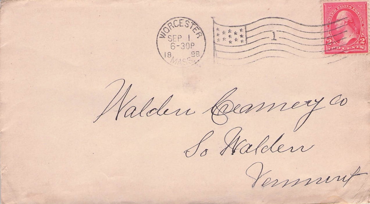 Worcester 1888 duplex with “W” in circle in bars; 1880s no pmk. but “W.P. Daniels [L]umber Dealer” corner [cover trimmed left]; 1898 Flag cancel on cover; 1907 machine cancel on post card, “Fire Department Building”; 1913 machine cancel on Postal Card of Ridgely Protective Association; 1932 machine cancel on cover; 1935 machine cancel (”2” in dial) on Postal Card; 1940 machine slogan “Buy U.S. Savings Bonds” on linen post card of “Telephone Building.”