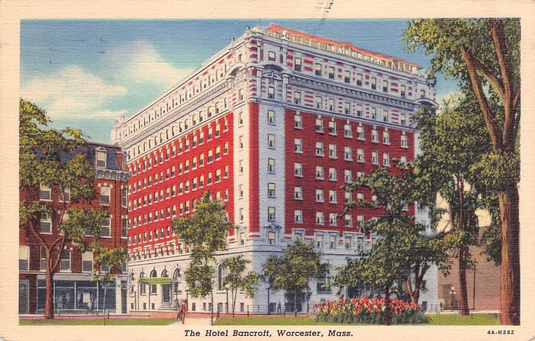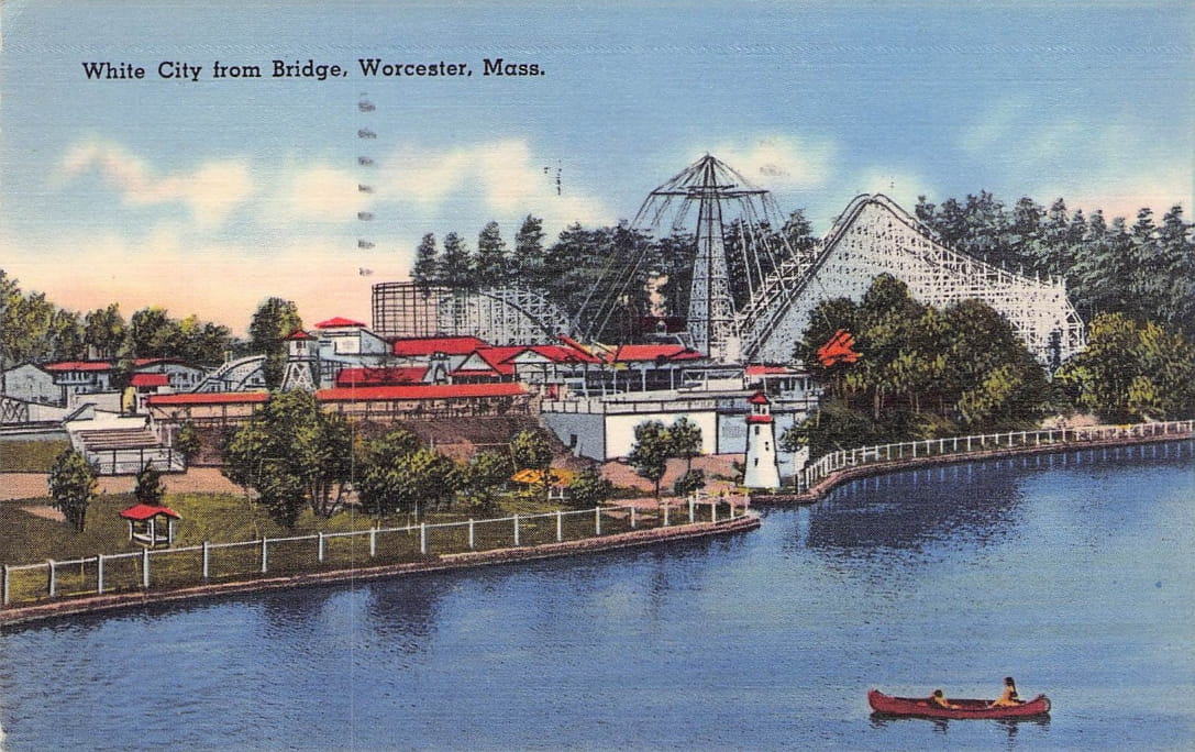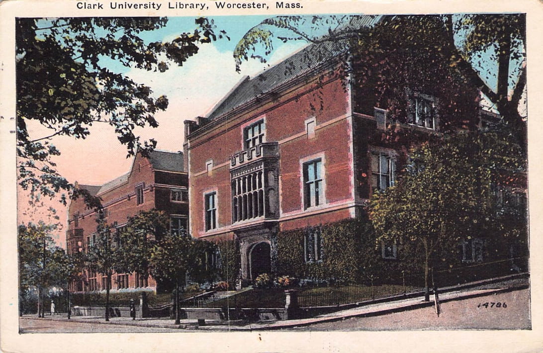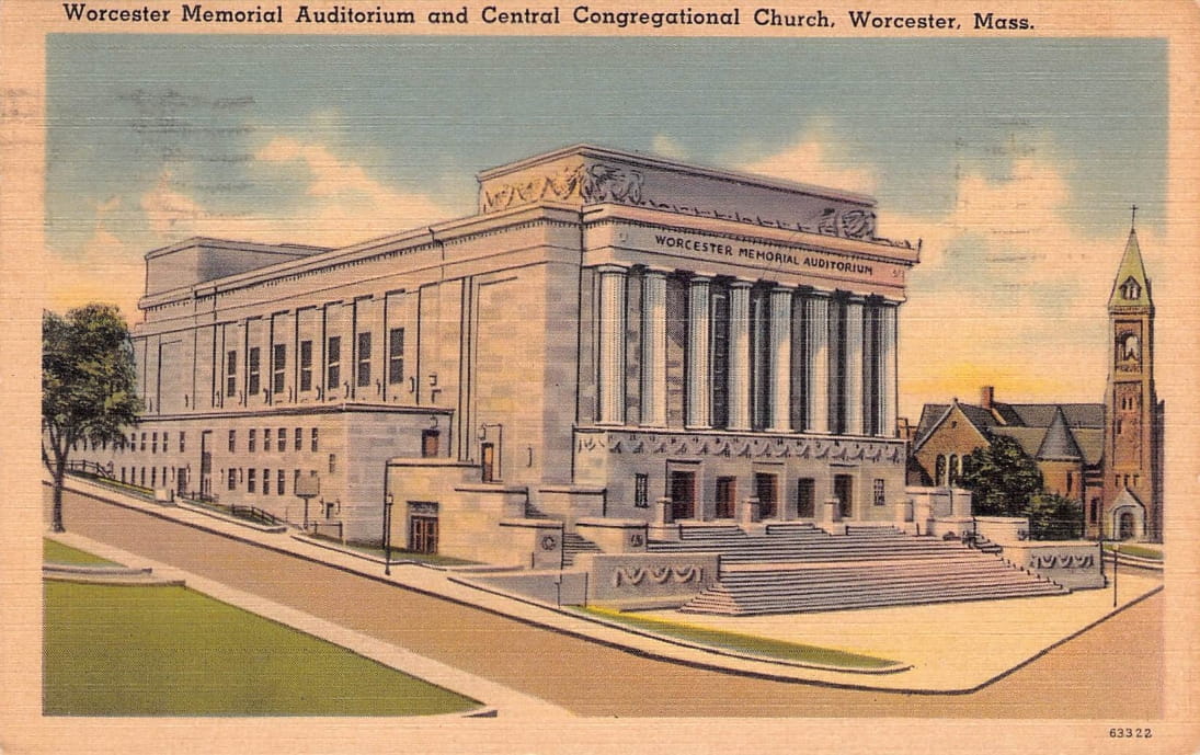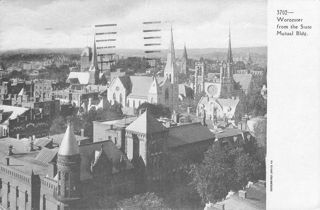 Post Cards: “Worcester from the State Mutual Bldg.” [c.1910 view, pmkd. 1961, postal blemish on view side]; Hahnemann Hospital [linen, minor scuffs]; Worcester Center [chrome]; Clark University Library [white border, 1924]; Clark University, Jonas G. Clark building [chrome]; Memorial Auditorium [linen]; St. Paul’s Church [linen, 1940]; Hotel Bancroft [linen]; “White City from Bridge” [amusement park, linen, 1940]; Holy Cross College [linen, 1940]; “Rustic Bridge, Elm Park [1909]; Crompton Park pond [1915]