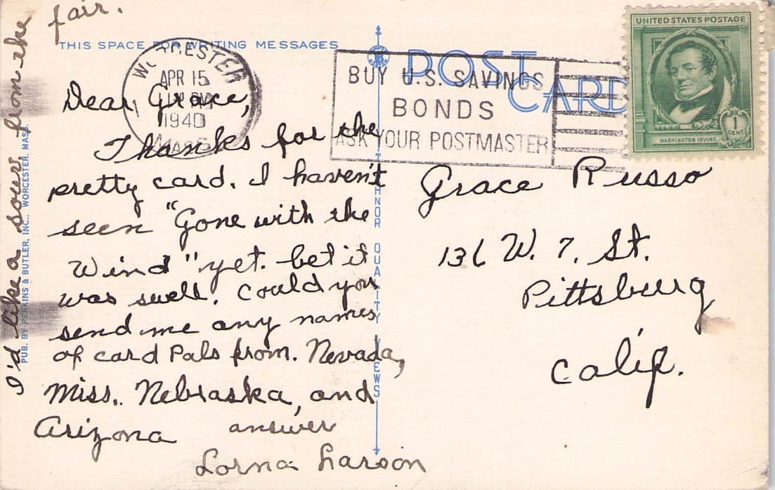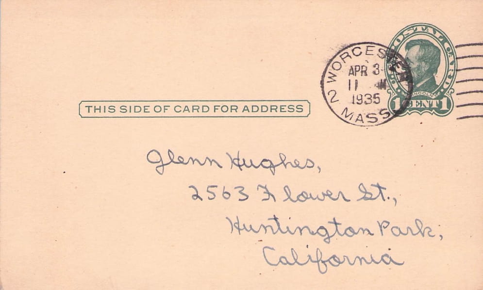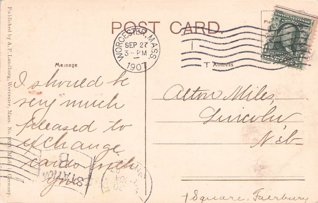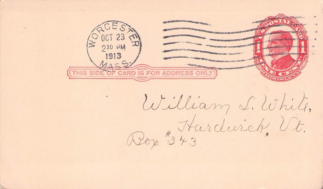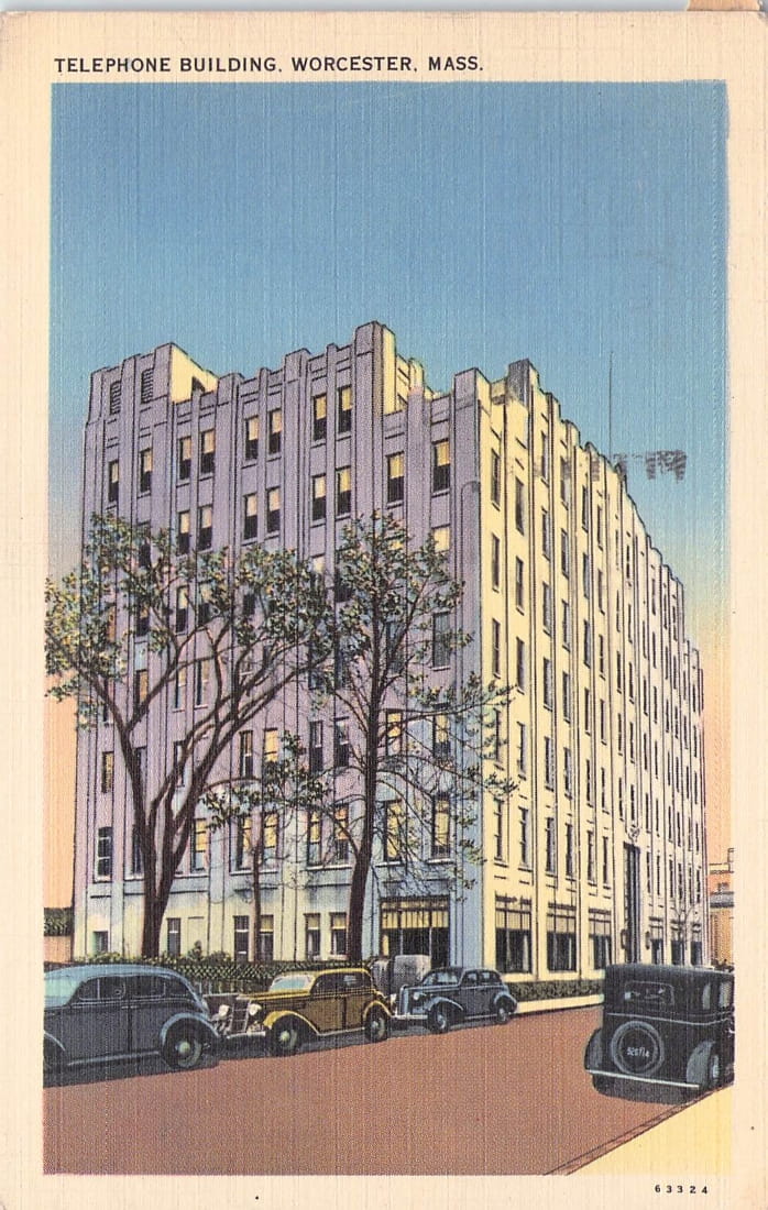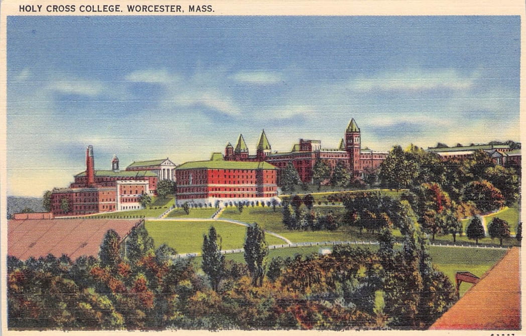 Post Cards: “Worcester from the State Mutual Bldg.” [c.1910 view, pmkd. 1961, postal blemish on view side]; Hahnemann Hospital [linen, minor scuffs]; Worcester Center [chrome]; Clark University Library [white border, 1924]; Clark University, Jonas G. Clark building [chrome]; Memorial Auditorium [linen]; St. Paul’s Church [linen, 1940]; Hotel Bancroft [linen]; “White City from Bridge” [amusement park, linen, 1940]; Holy Cross College [linen, 1940]; “Rustic Bridge, Elm Park [1909]; Crompton Park pond [1915]