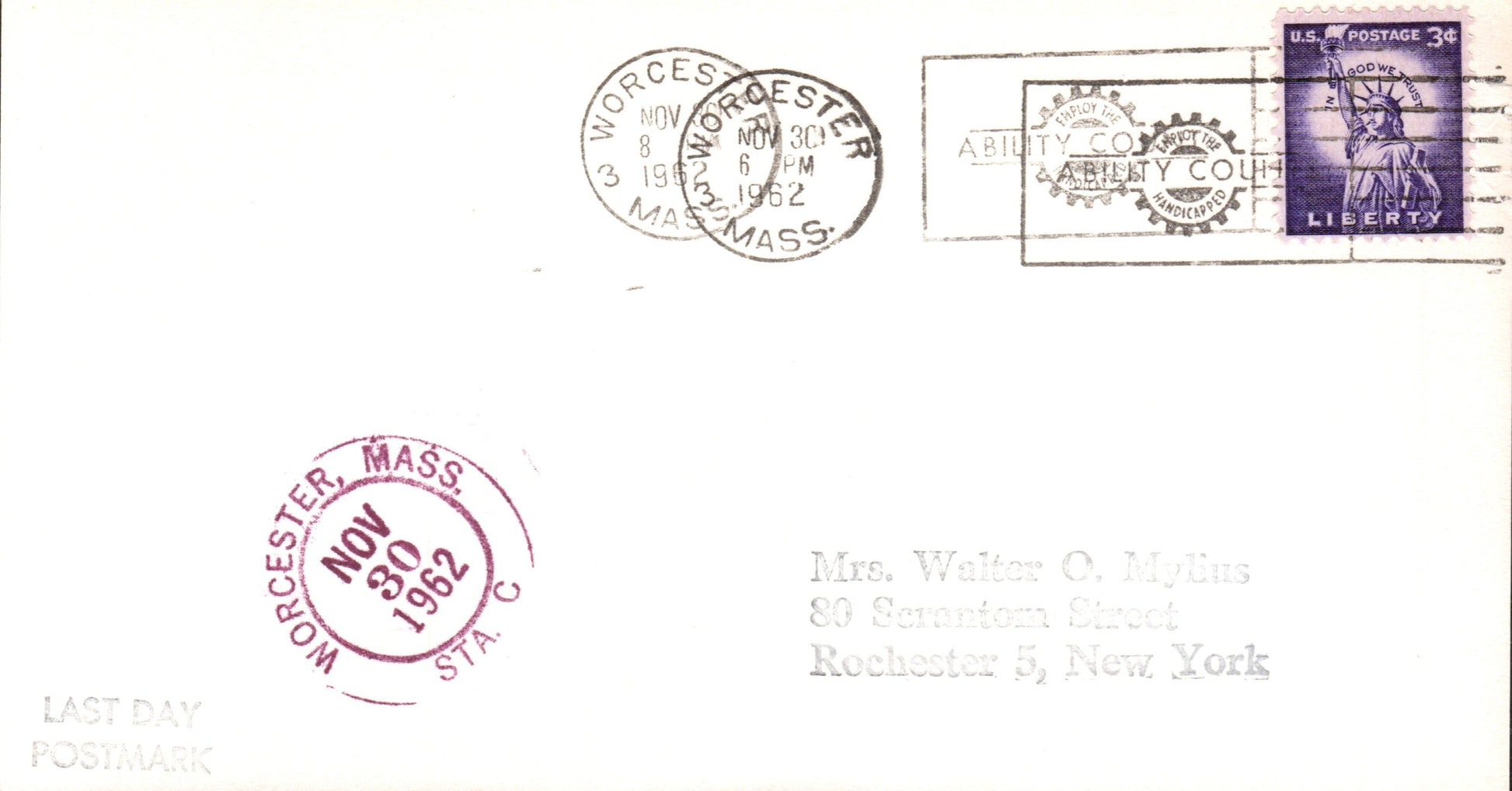 Worcester Sta. C 1962 double circle as auxiliary on LD cover pmkd. Worcester machine slogan “Becker Junior College 75th Anniversary”