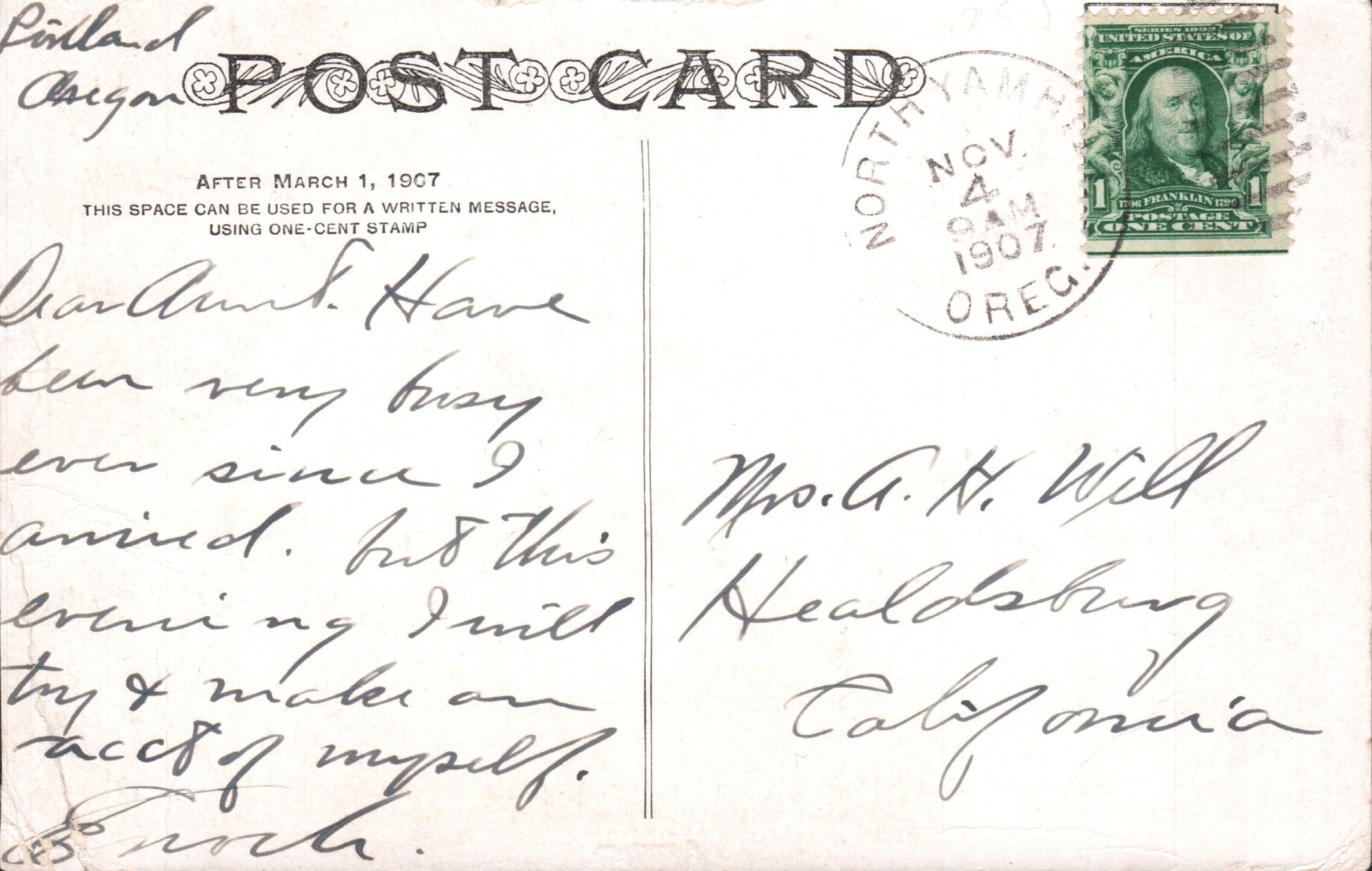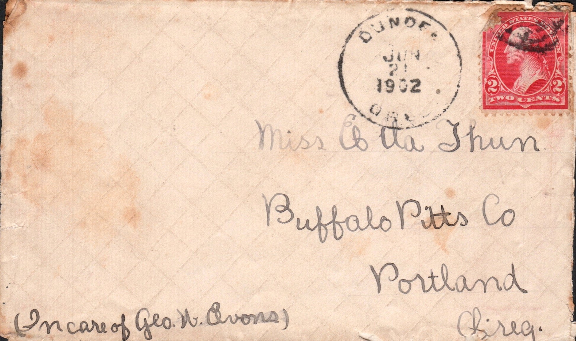 Dundee 1902 cds on cover, Portland Sta. A backstamp; 1905 Doane on cover, ratty on left; 1976 4-bar on cover; 2009 Oregon Sesquicentennial pictorial cancel on cover