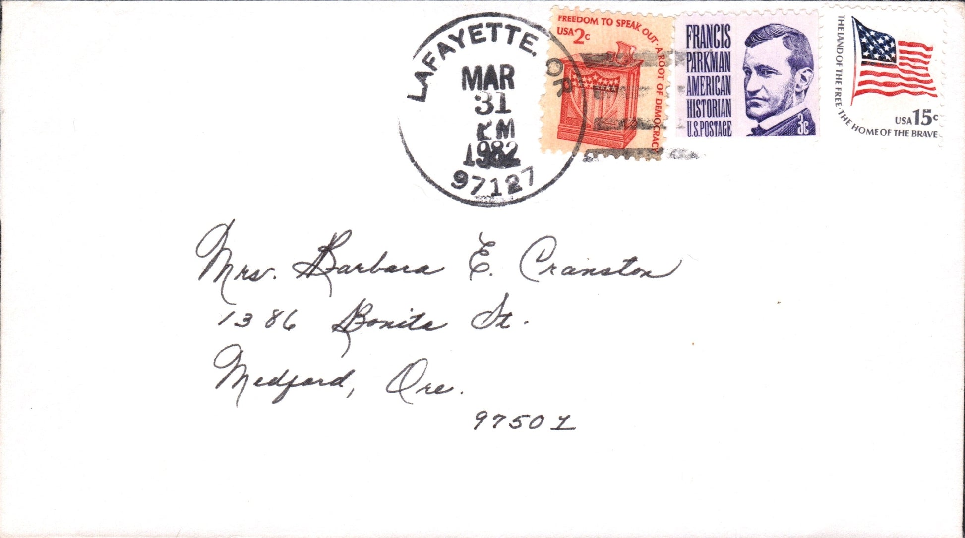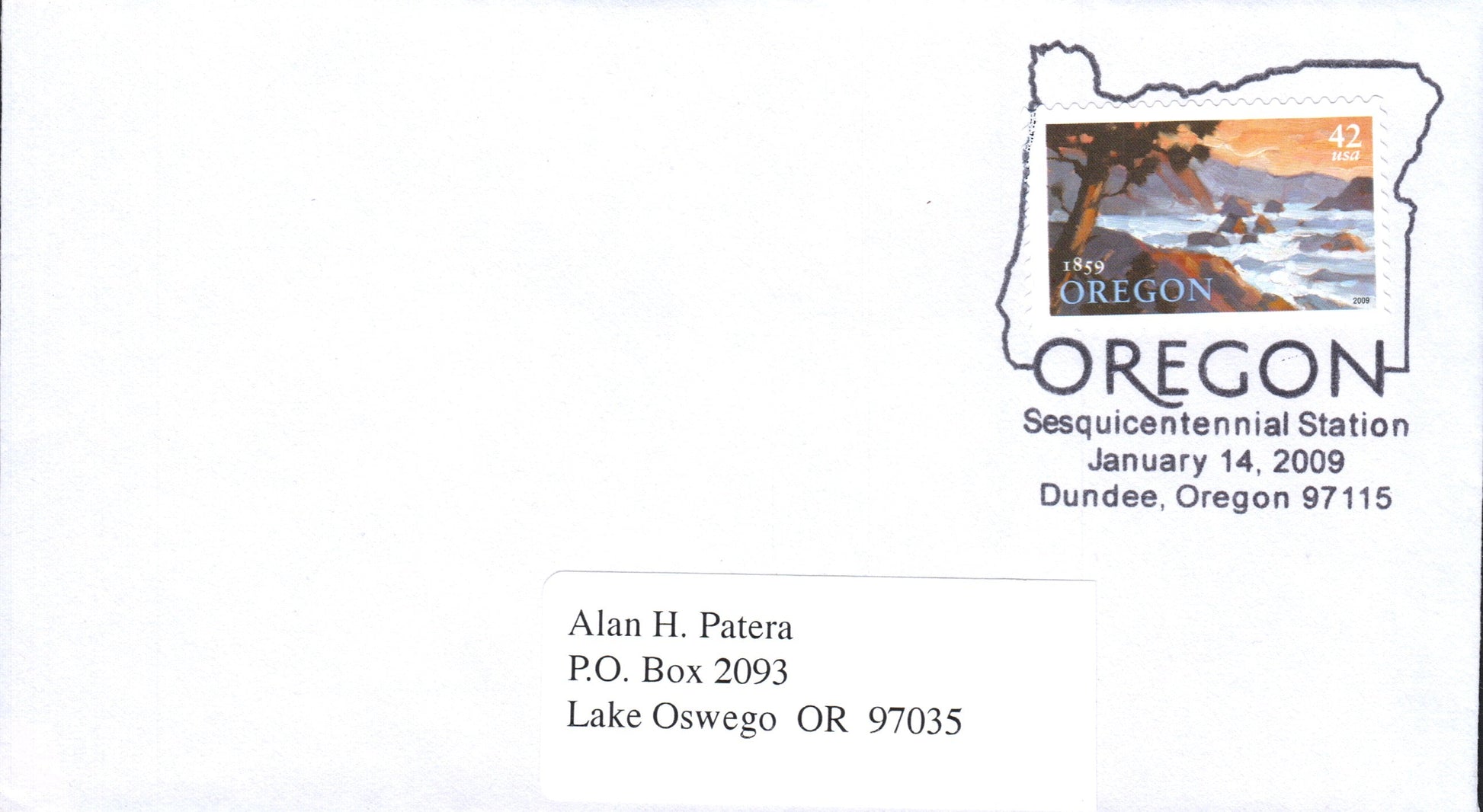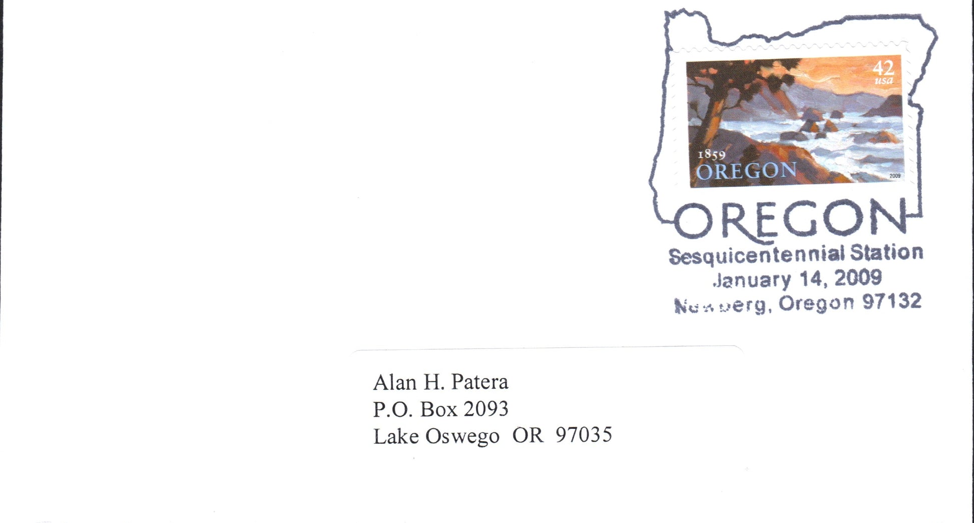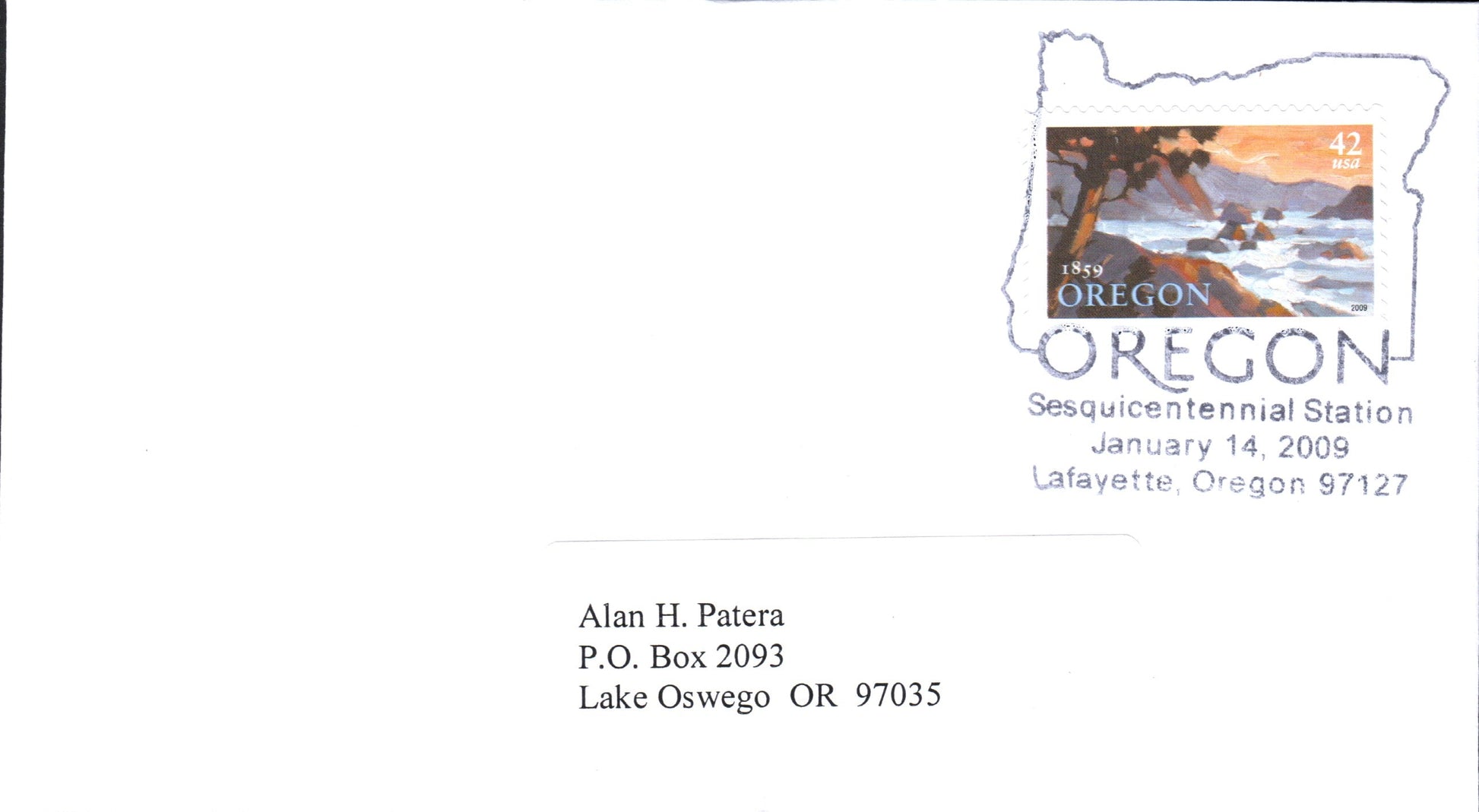 Lafayette 1982 4-bar on cover; 2009 Oregon Sesquicentennial pictorial cancel on cover