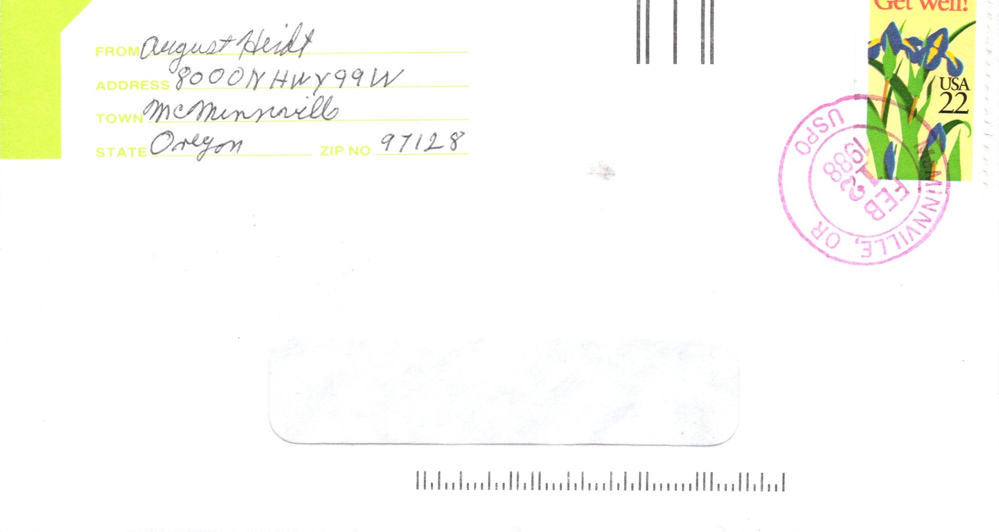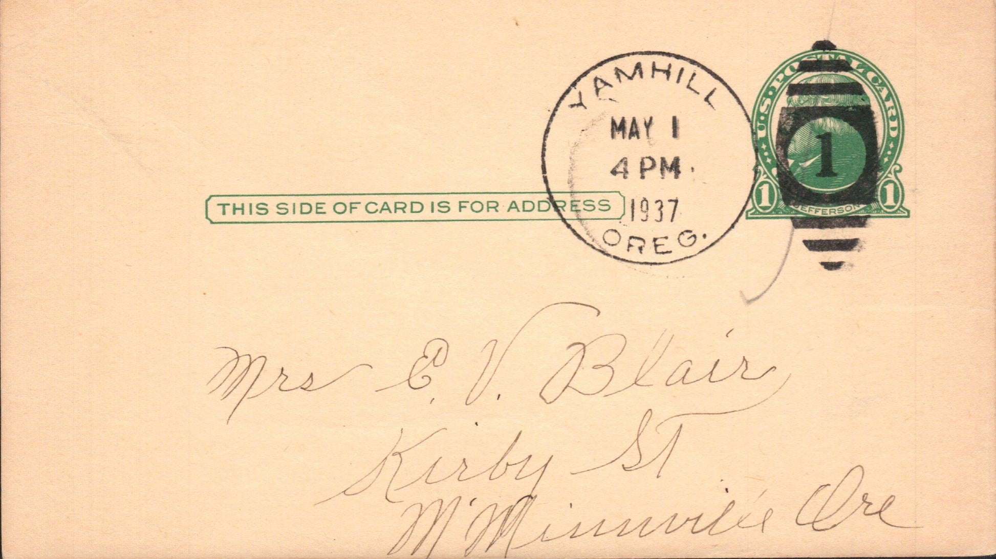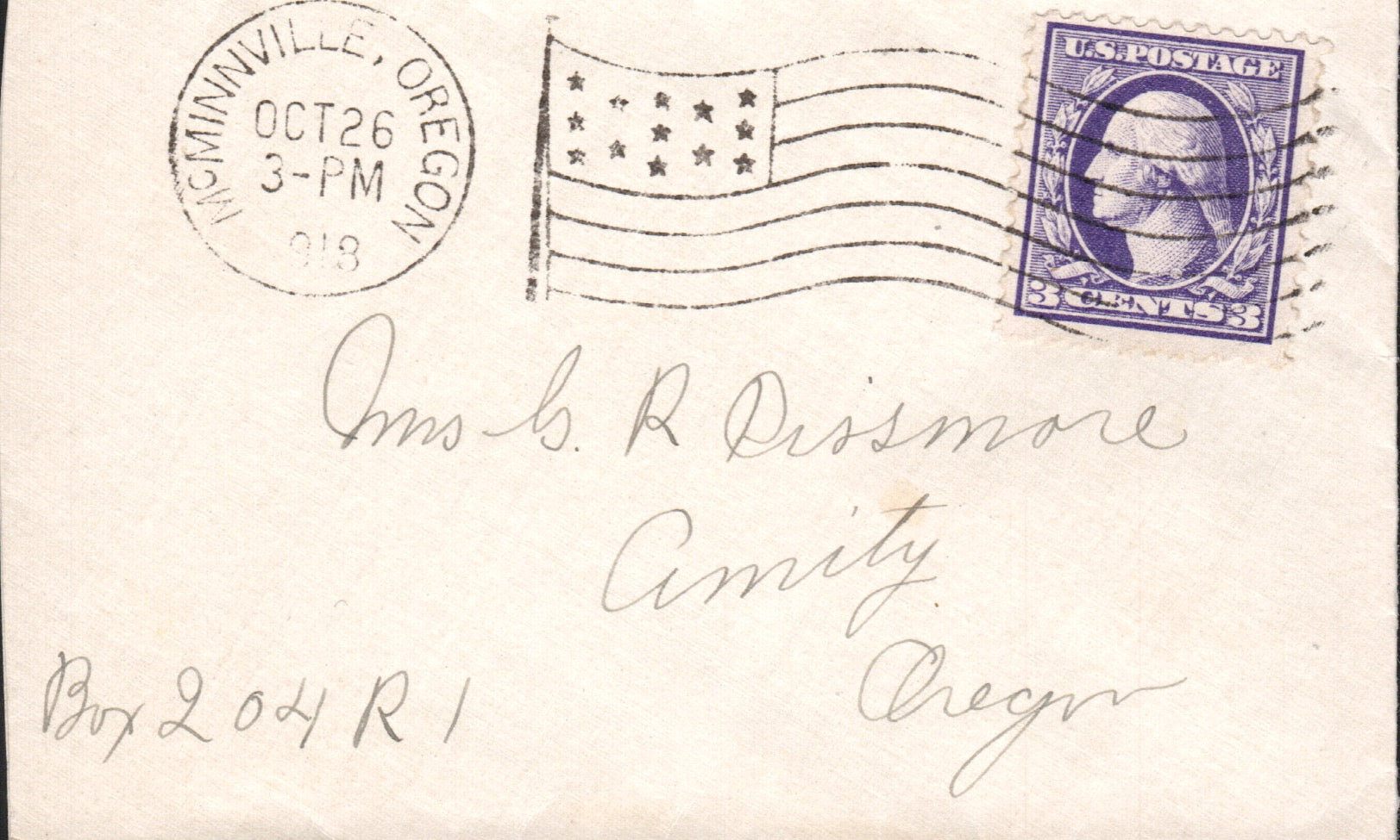 McMinnville 1900 duplex on Postal Card; 1907 duplex on post card; 1918 Flag cancel in tiny cover; 1948 machine cancel on cover; 1988 round dater on cover