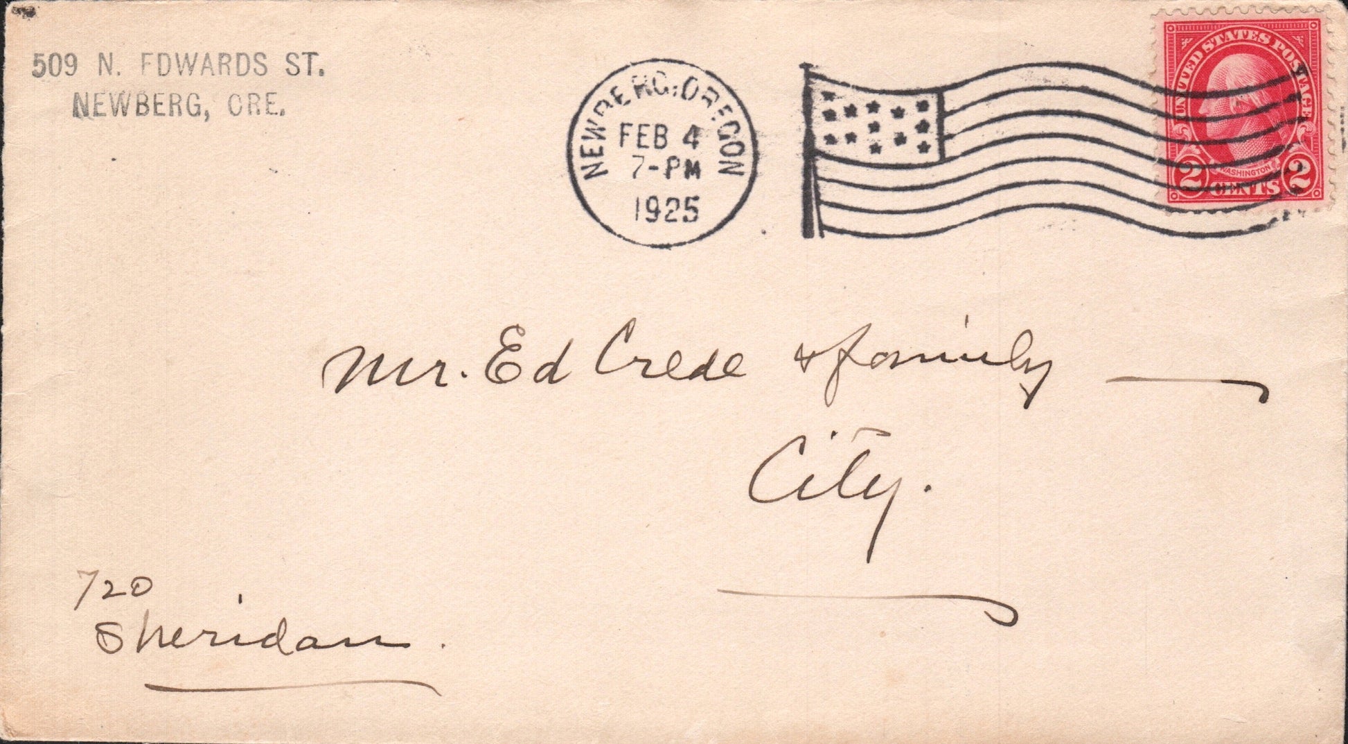 Newberg 1925 Flag cancel on cover, includes original letter; 1933 machine cancel on cover; 1977 machine cancel on cover; 2009 Oregon Sesquicentennial pictorial cancel on cover