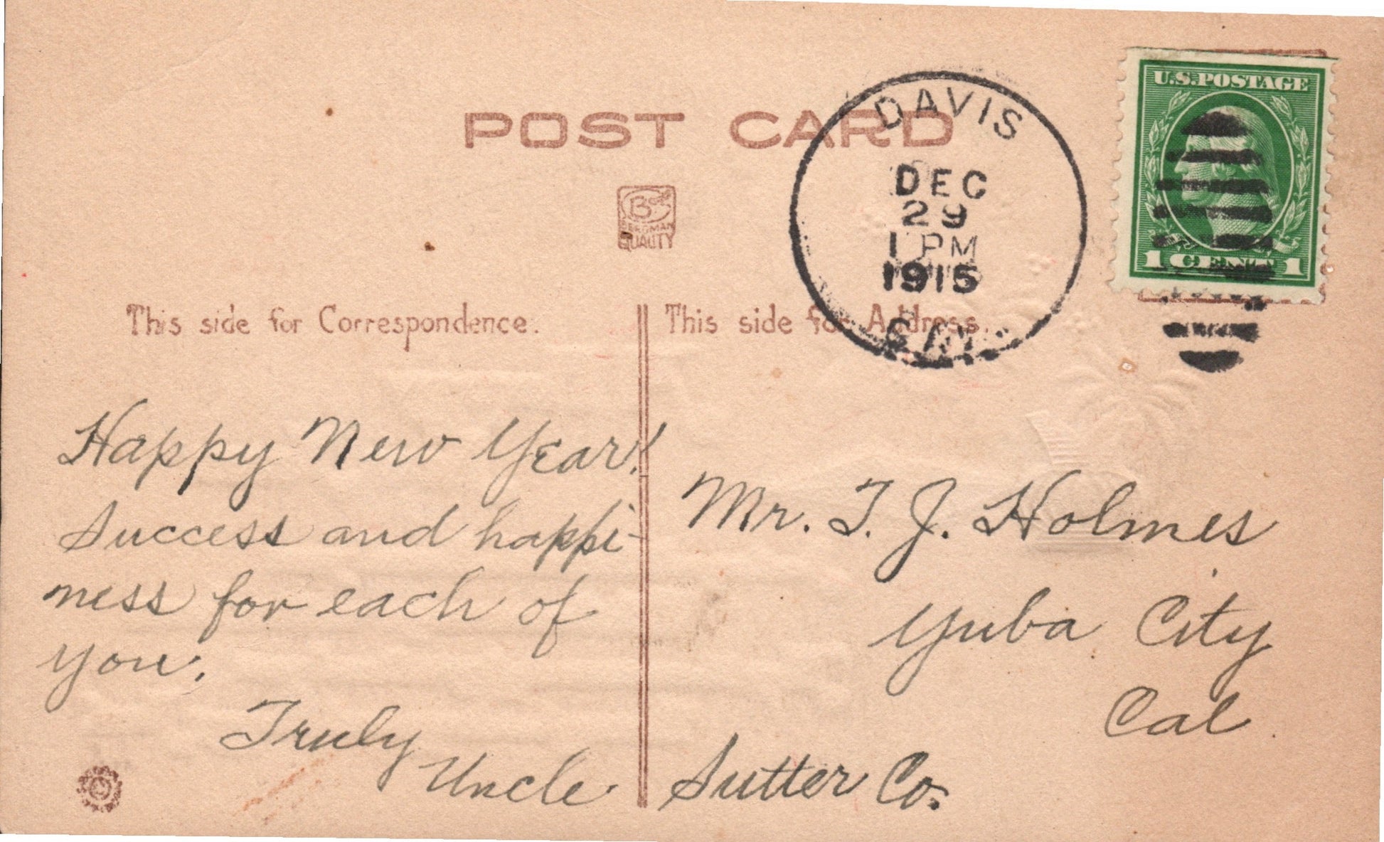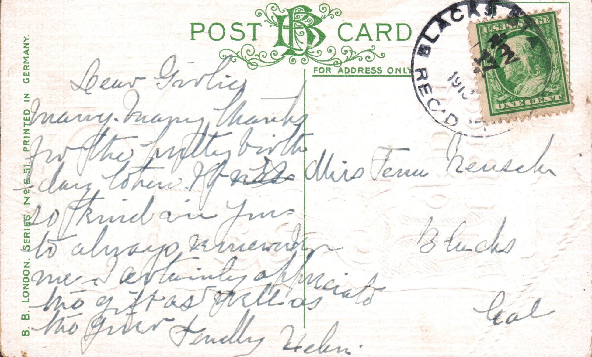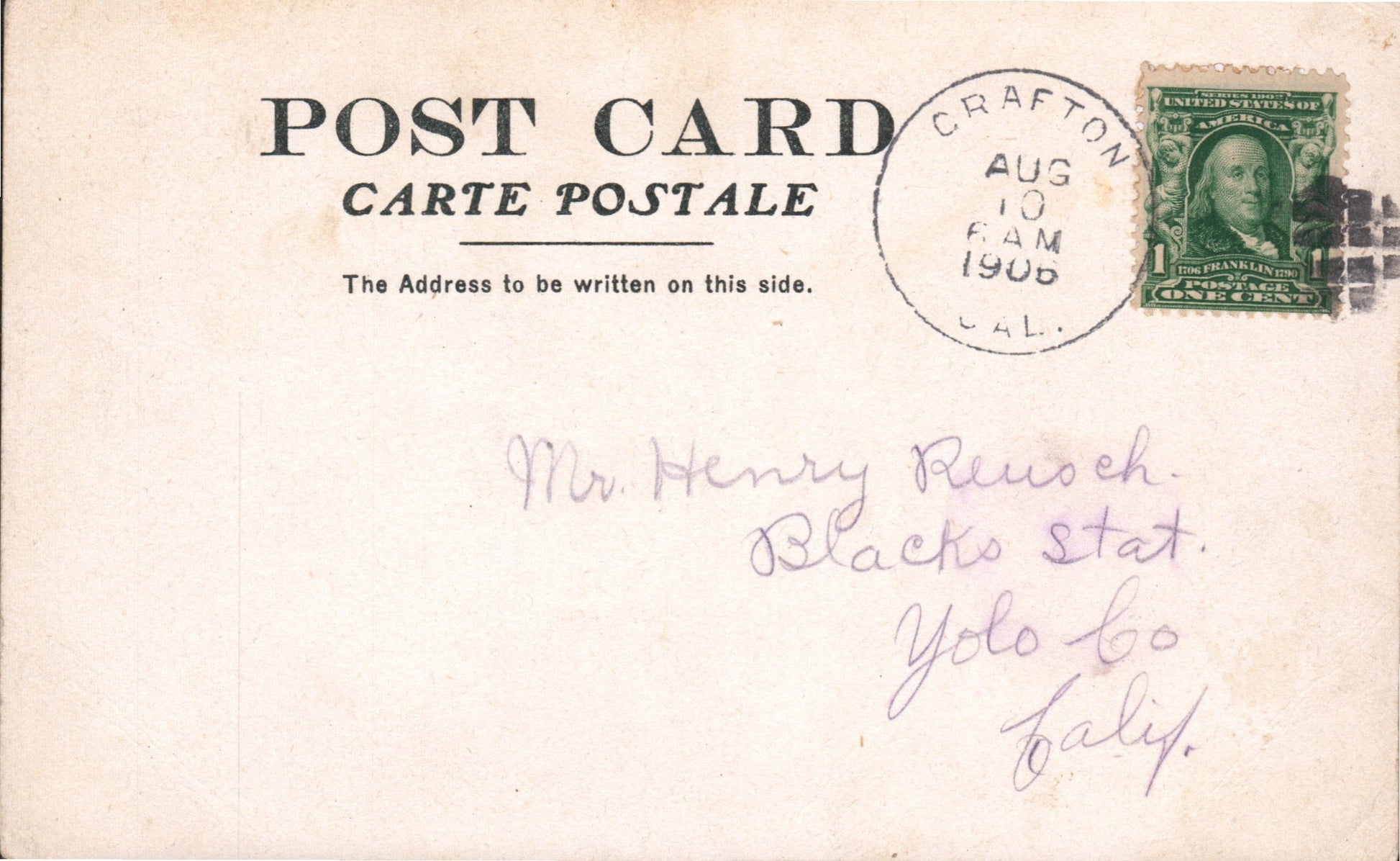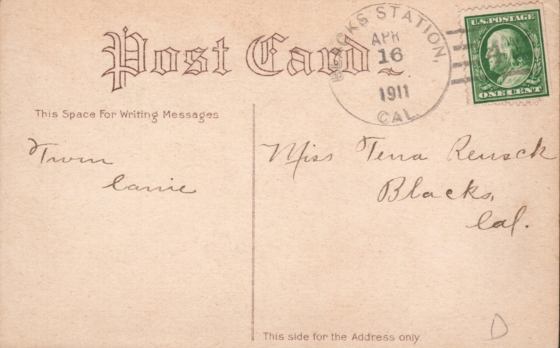 Blacks Station (1876-1915) 1905 Rec’d strike on postcard from Berlin (1876-1934, Colusa Co.); 1905 Doane on post card; 1910 diff. Rec’d strike on local delivery post card; 1911 4-bar on post card