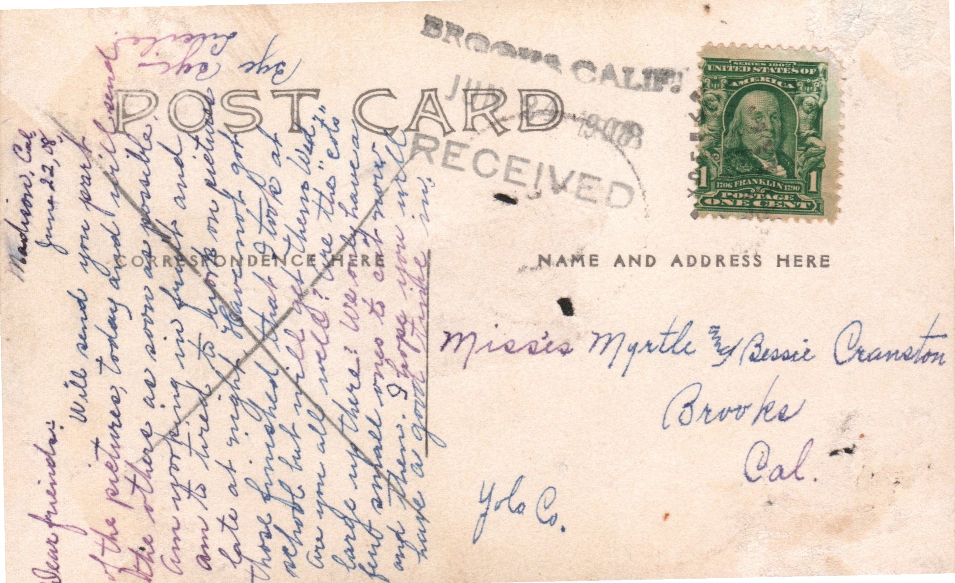 Yolo light 1906 duplex overstruck Brooks Rec’d on post card;1983 4-bar on unaddressed cover