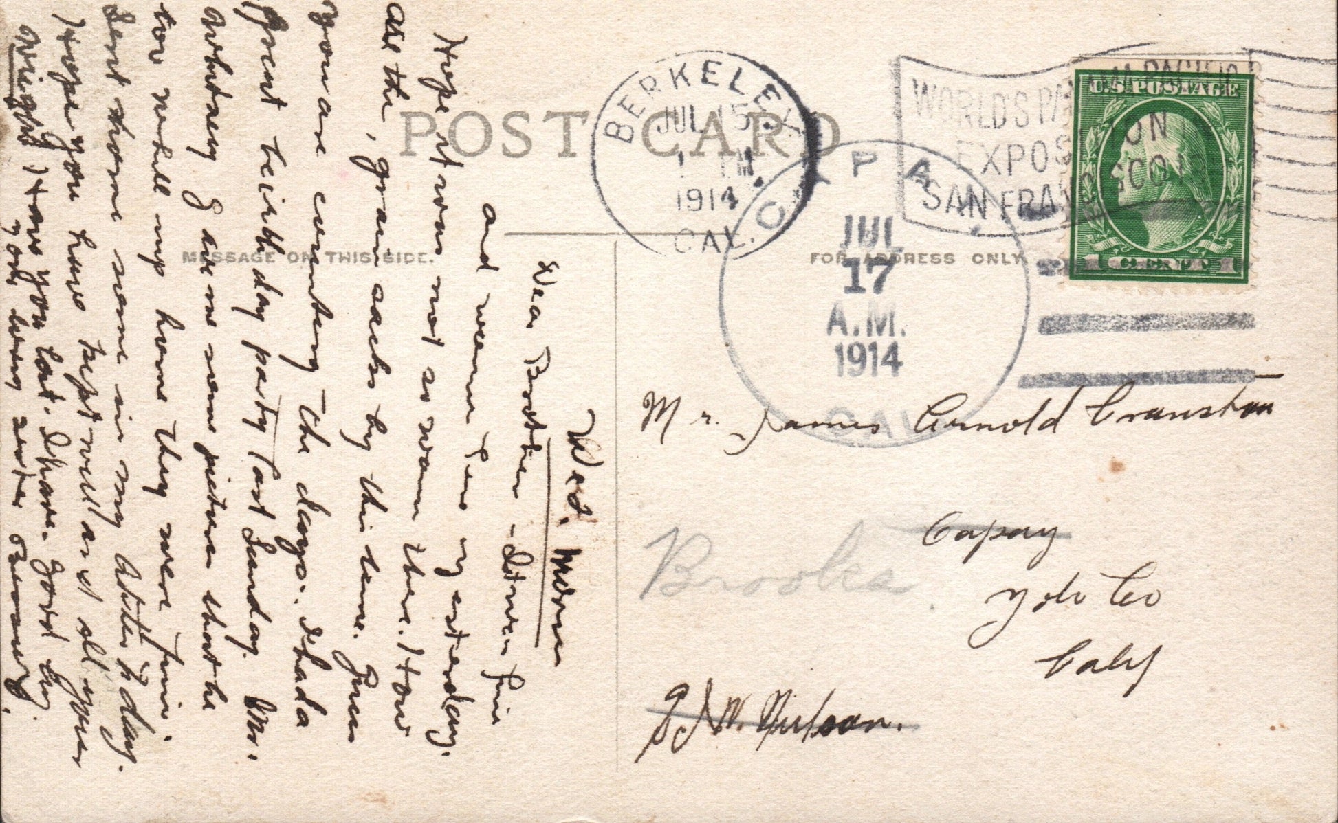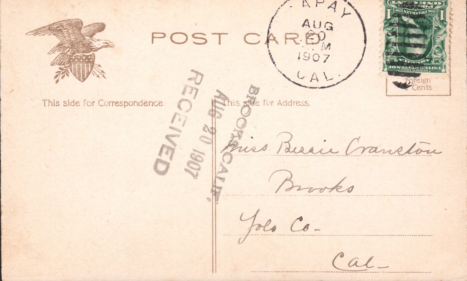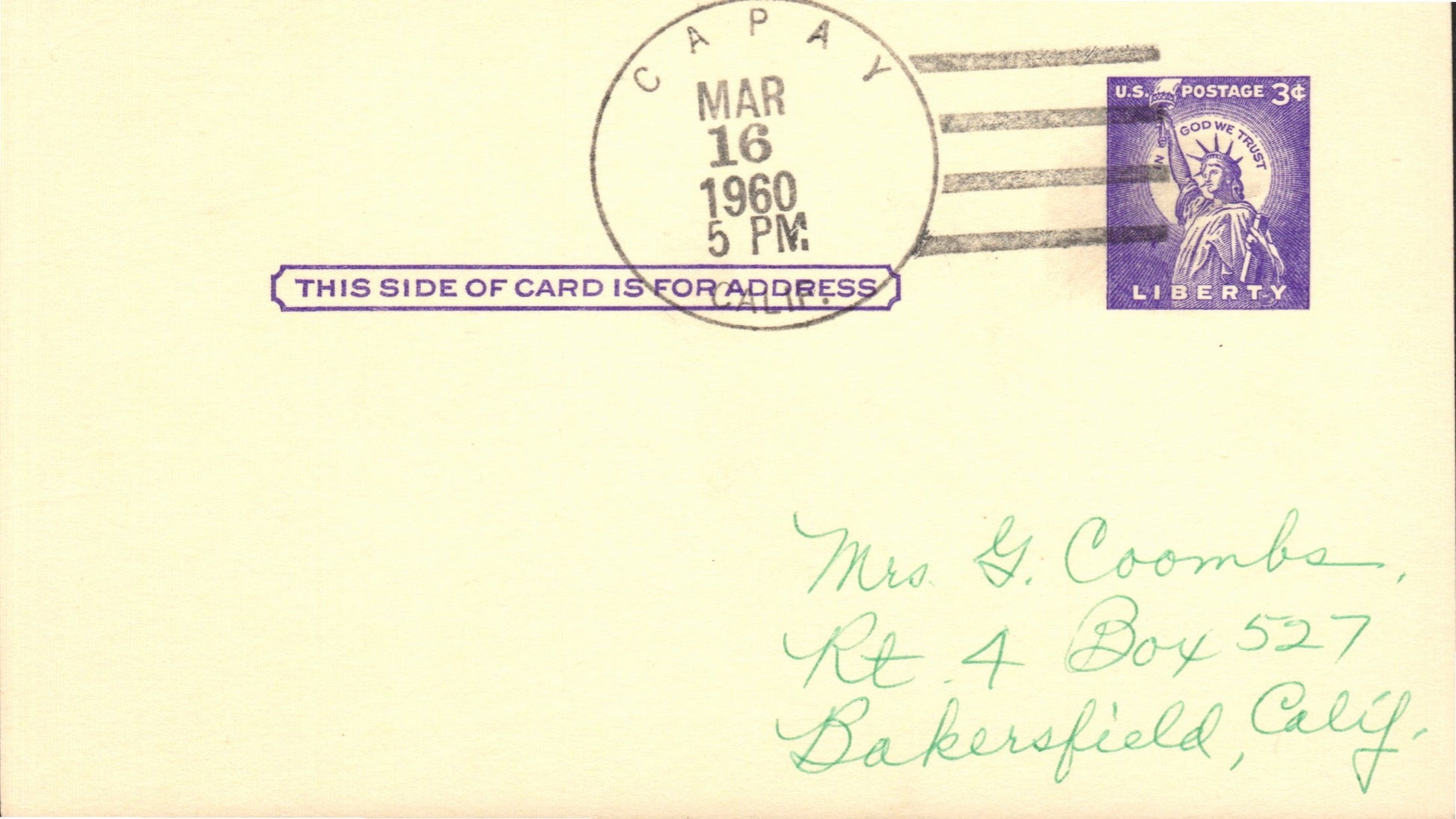Capay 1907 duplex on post card, also straight-line Brooks Rec’d; 1914 4-bar on post as rec’d strike on post card from Berkeley, view of U.C. East Hall; 1960 4-bar on Postal Card; 1965 4-bar on cover