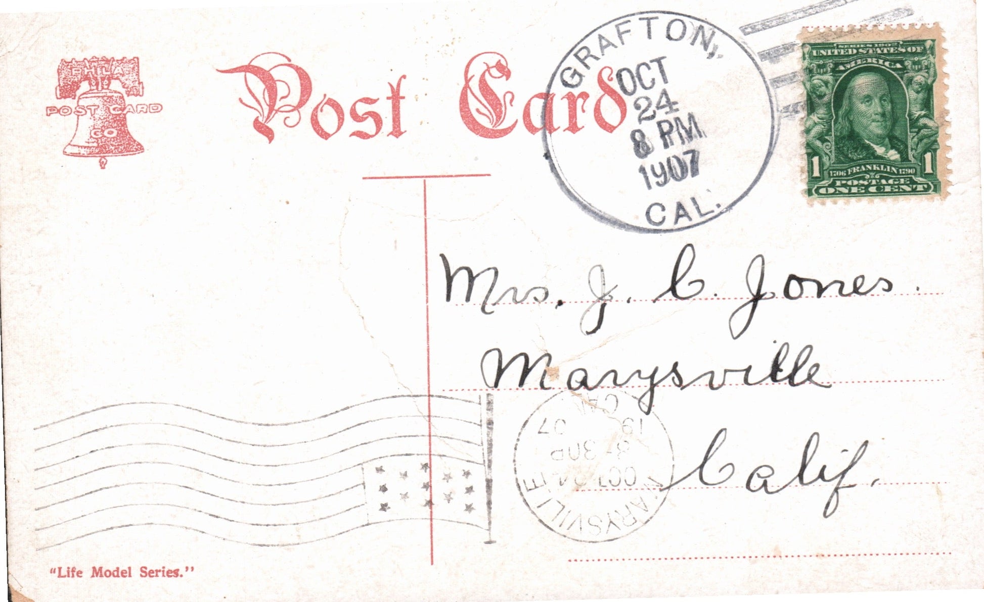 Grafton (1854/1925) 1906 cds on post card; 1907 4-bar on post card