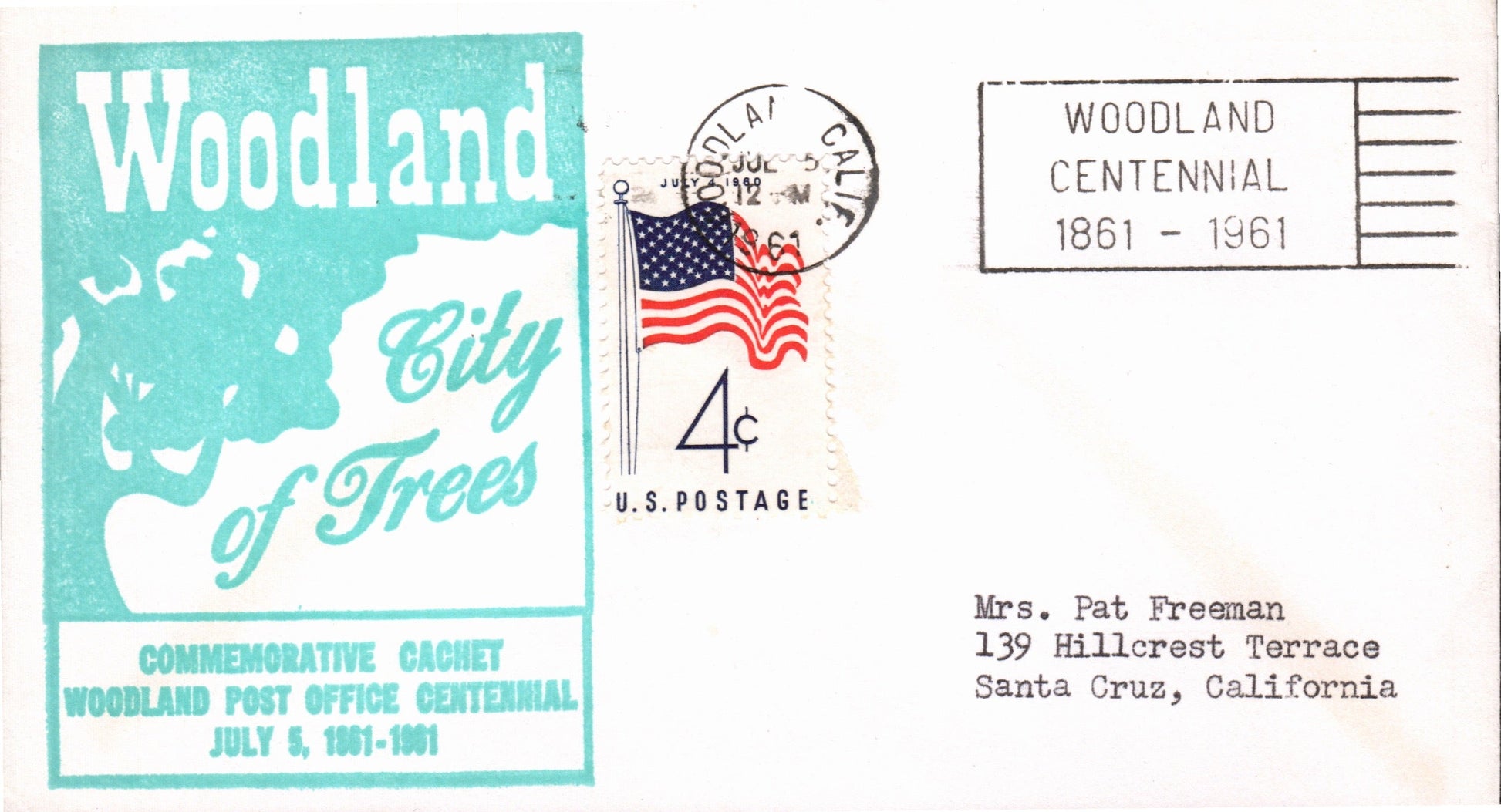 Woodland 1880s cds on cover; 1911 machine cancel on post card; 1927 machine cancel on post card; 1940 duplex on cover; 1947 machine cancel on post card; 1961 machine slogan, Centennial of Woodland, cachet